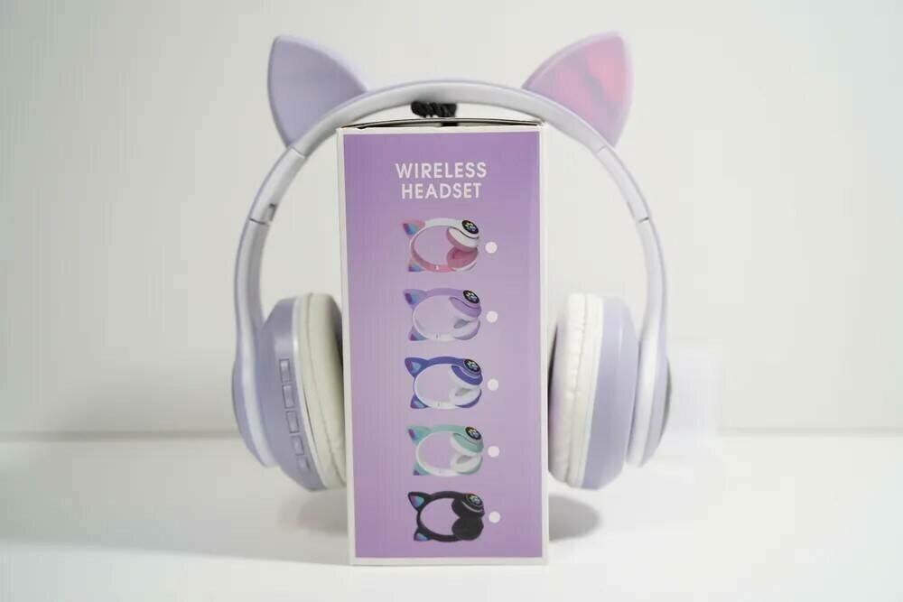 Светящиеся детские беспроводные наушники с ушками / Беспроводные наушники детские / Наушники с ушами / Сиреневый