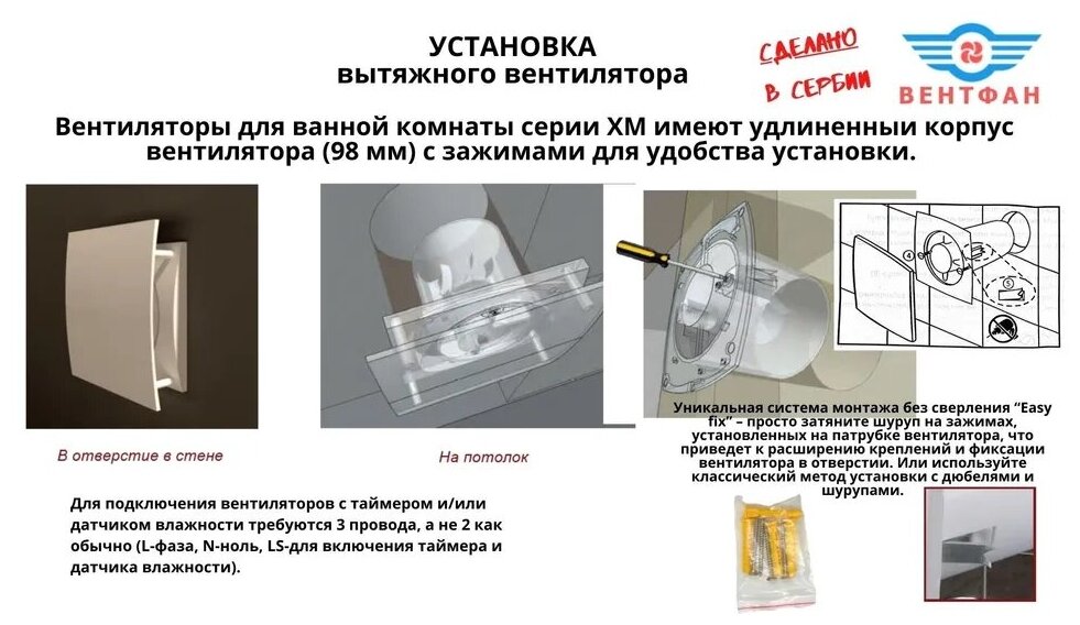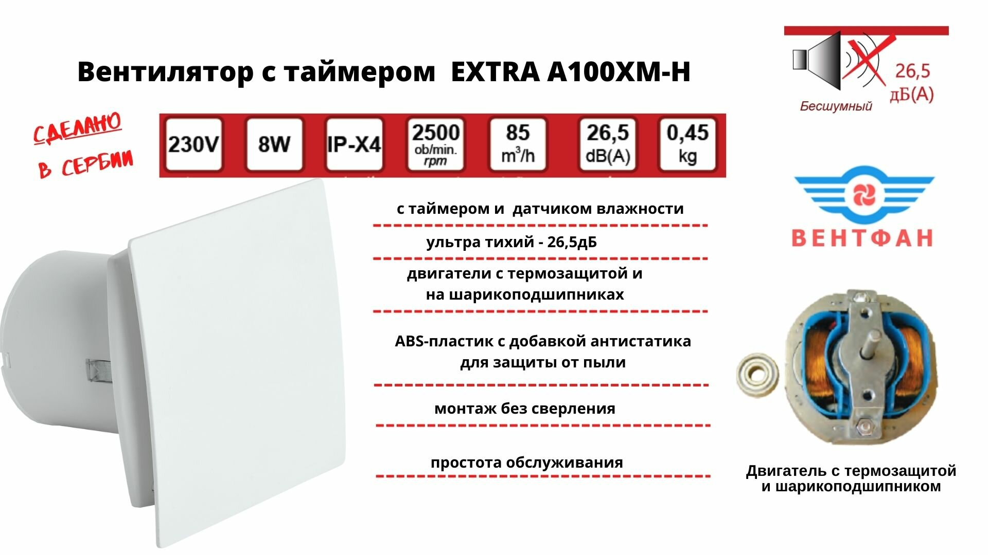Вентилятор с таймером и датчиком влажности, тихий 26dB, 8 Вт, с обратным клапаном и креплением без сверления, D 100мм, EXTRA A100XM-H, белый, Сербия интересное: