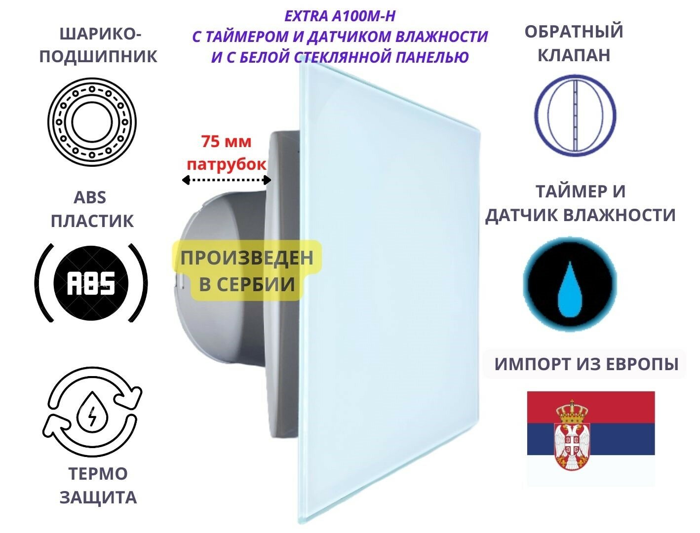Вентилятор с таймером и датчиком влажности, D100мм, со стеклянной белой панелью и с обратным клапаном EXTRA A100М-H, Сербия интересное:
