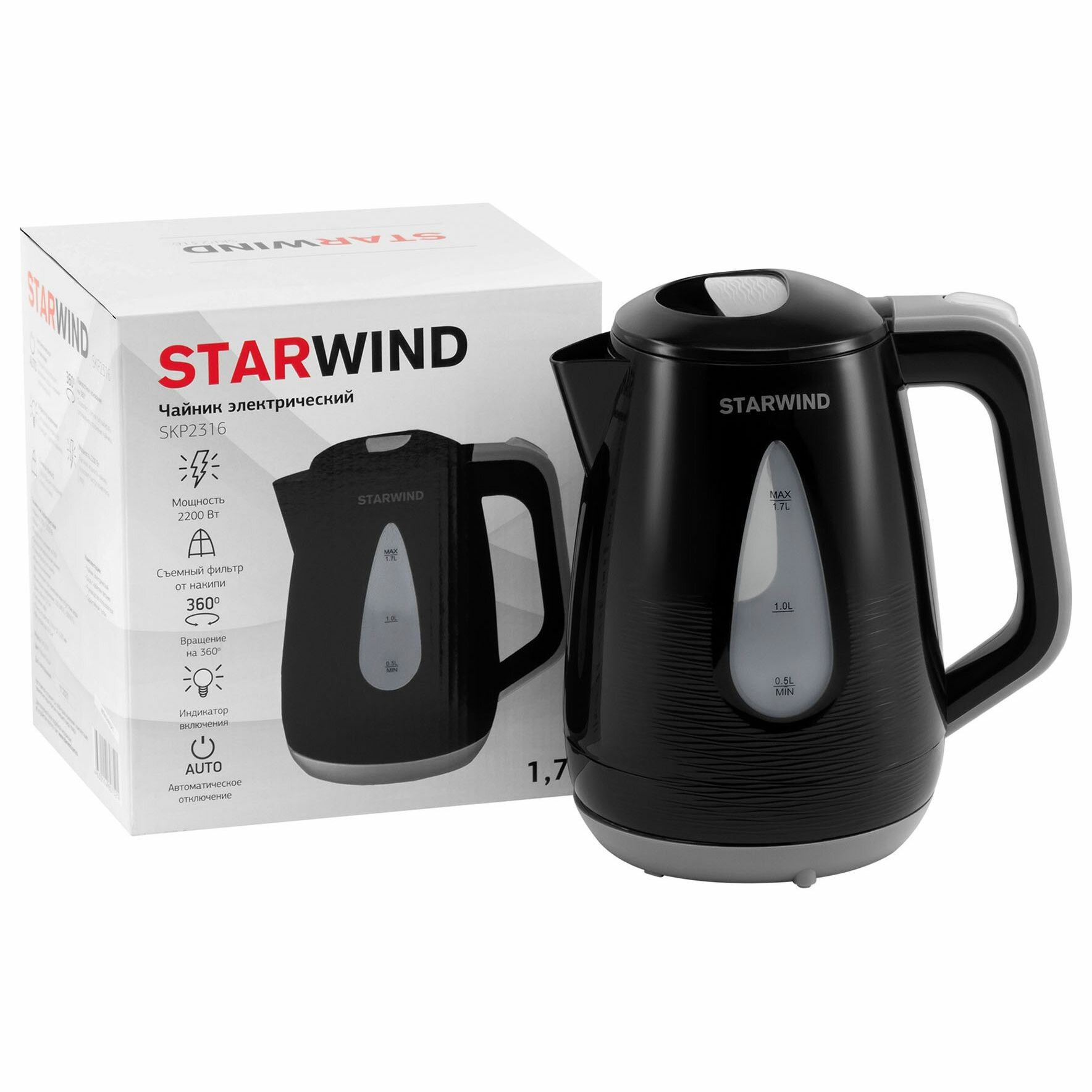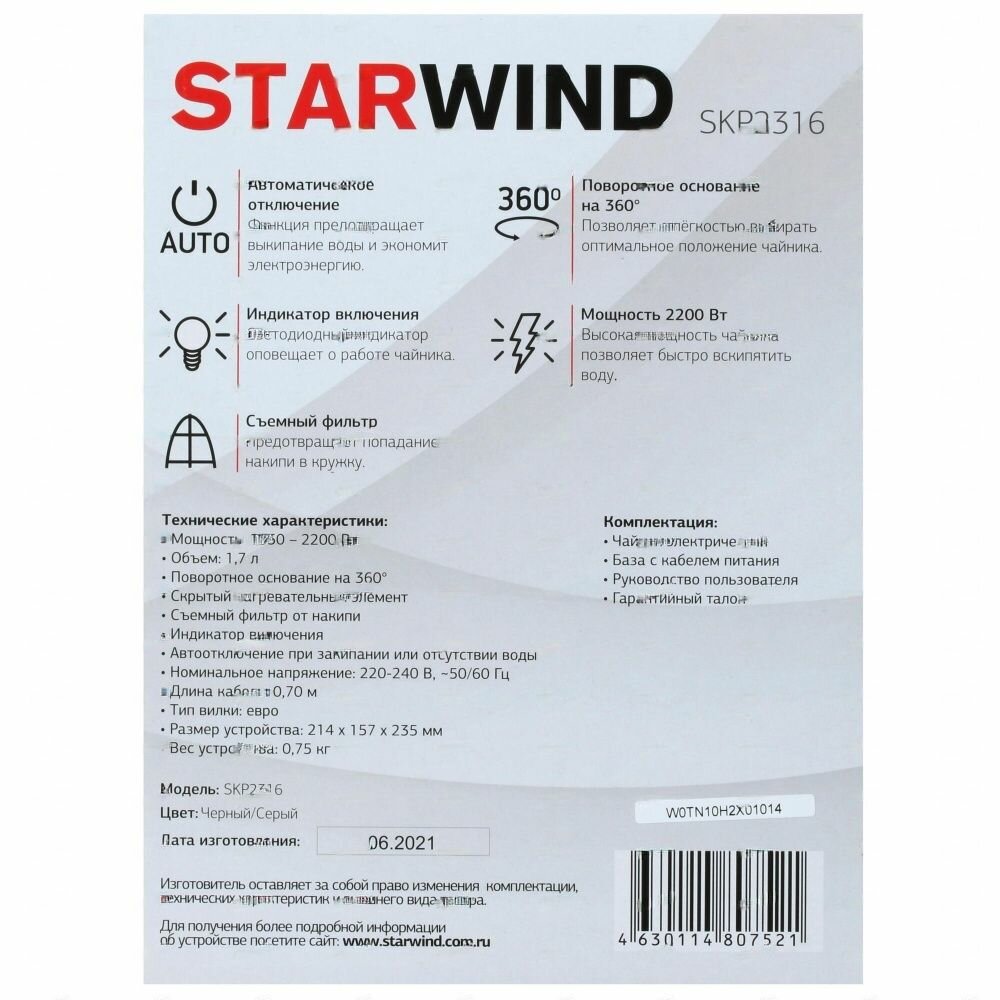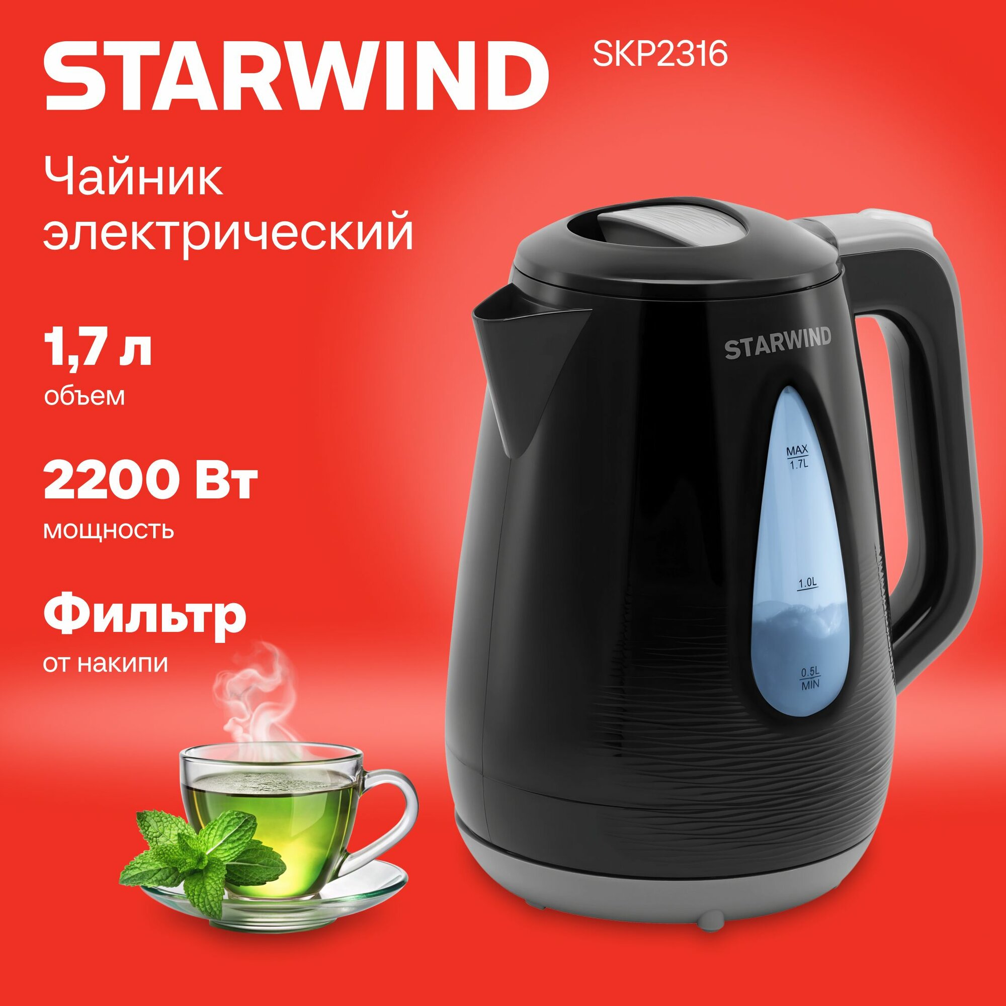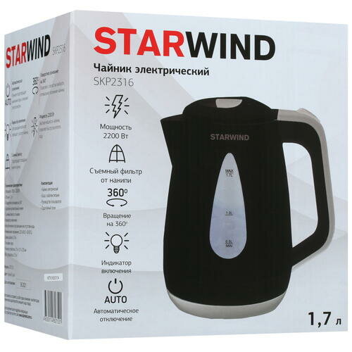 Электрочайник Starwind SKP2316 [пластик, 1.7 л, 2200 Вт, фильтр, скрытый нагревательный элемент, чер