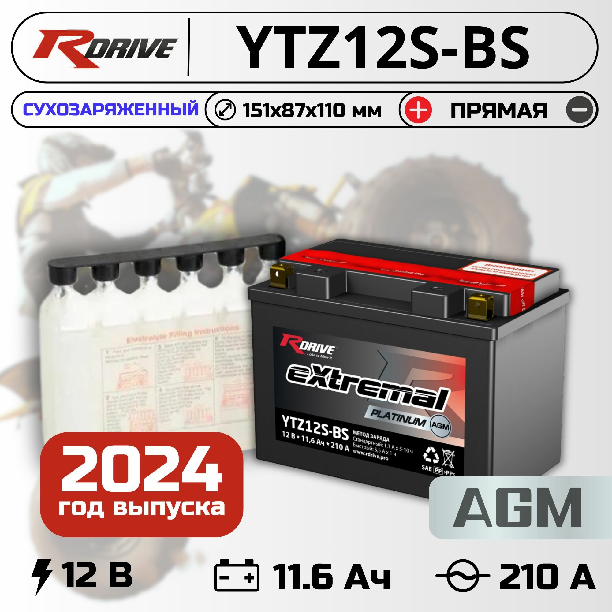 Мото аккумулятор RDrive YTZ12S-BS, 12В, 11Ач, прямая полярность, стартерный, cухозаряженный AGM