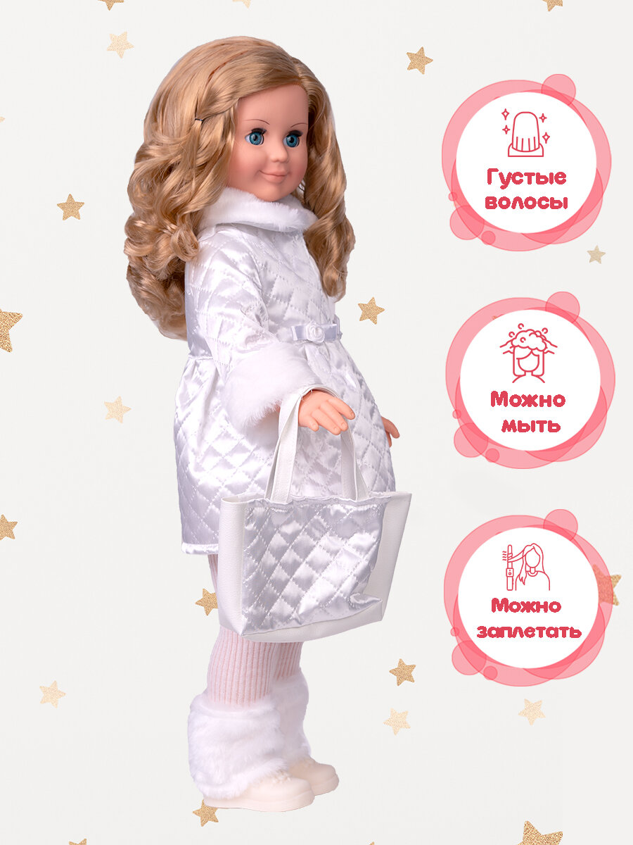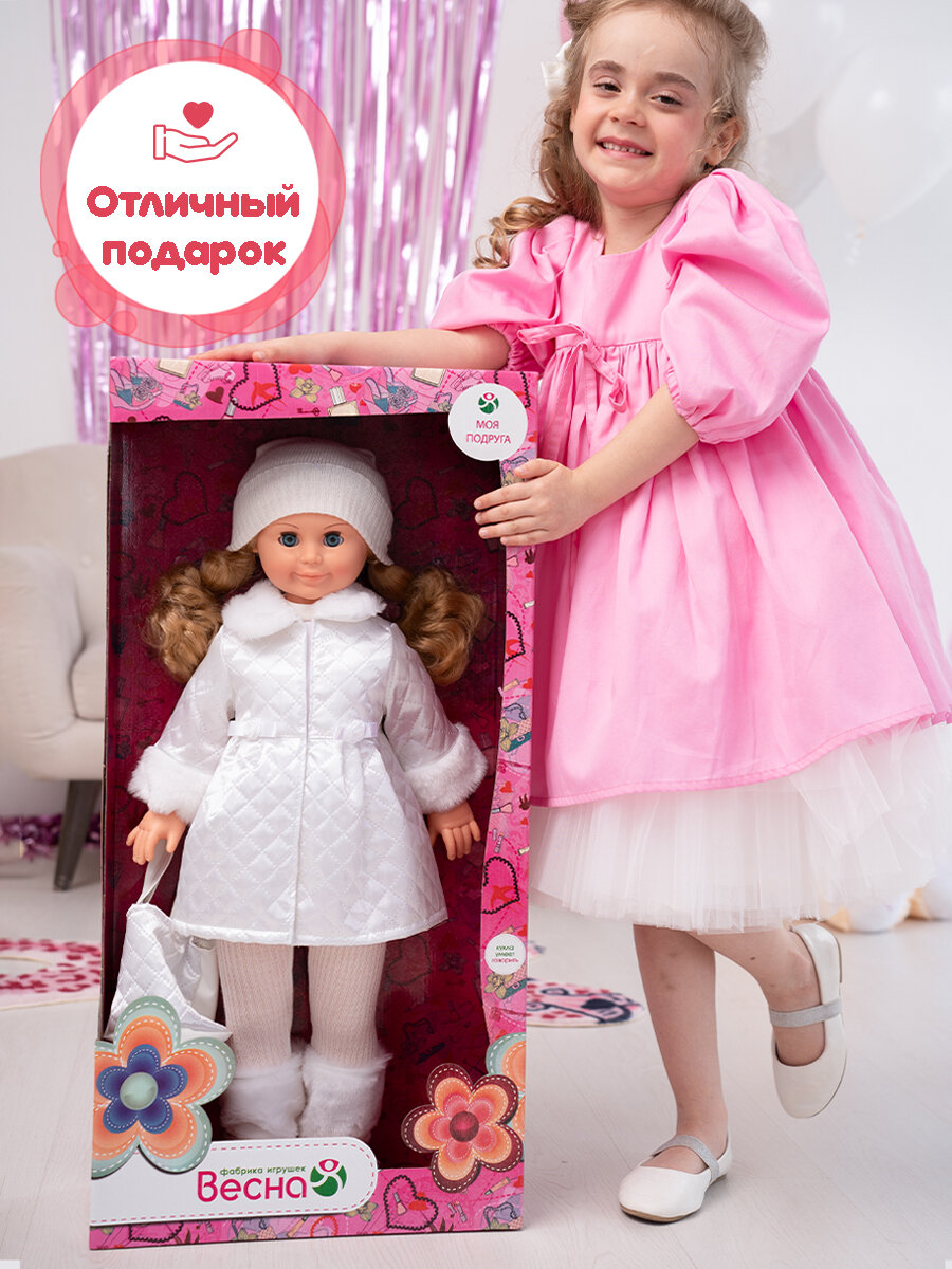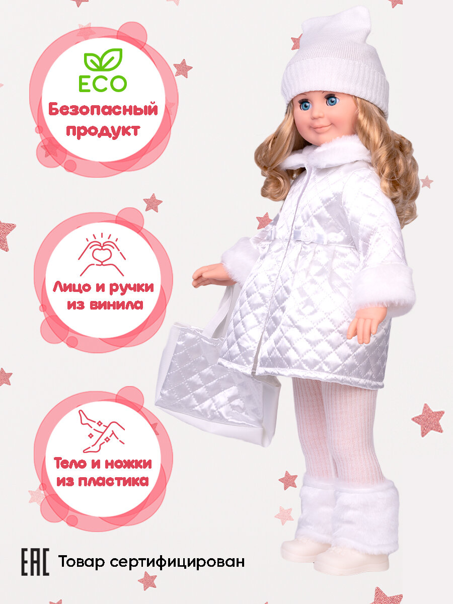 | Дополнительная информация | кукла произносит следующие фразы: Здравствуй! Я - твоя подружка Давай дружить; комплект одежды входит: вязаные джемпер, шапка и колготки; куртка с манжетами и воротником из меха и гетры из искусственного меха; комплект дополнен туфлями |