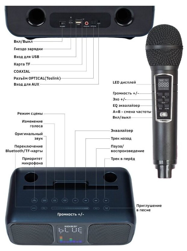 SD-318 Dark Gray - беспроводная караоке система, 2 радиомикрофона, USB, Bluetooth, оптический вход интересное: