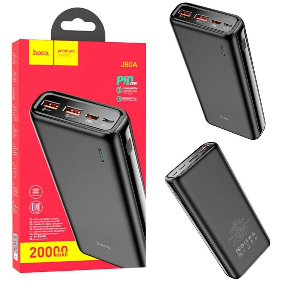 Внешний АКБ HOCO J80A Premium 20000mAh, 2xUSB, 1xUSB-C, 3А, QC3.0, PD20W, 22,5W, Li-Pol (черный)