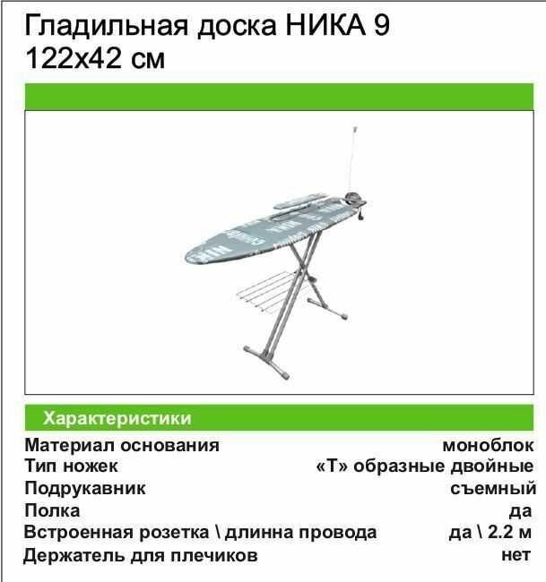 Ниже Вы можете прочитать отзывы на Гладильная доска Nika Ника-9, ознакомится с подробными характеристиками, посмотреть интересные обзоры и фотографии на Гладильная доска Nika Ника-9.