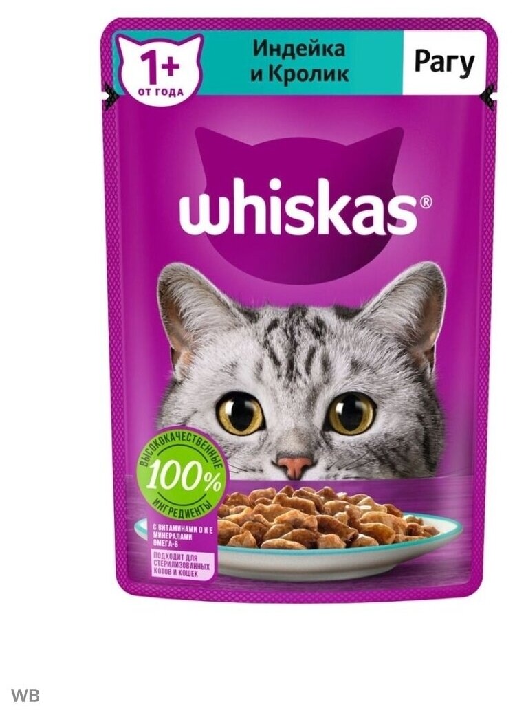 Купить Whiskas влажный корм для кошек, рагу с индейкой и кроликом (28шт в уп) 75 гр