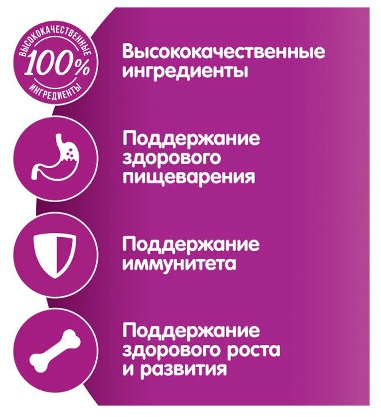 | Состав | Мясо и субпродукты (в том числе курица), продукты животного происхождения, минеральные вещества, загустители, аминокислоты (в том числе таурин), витамины, свекловичный жом, подсолнечное масло, сахара, антиоксиданты. |