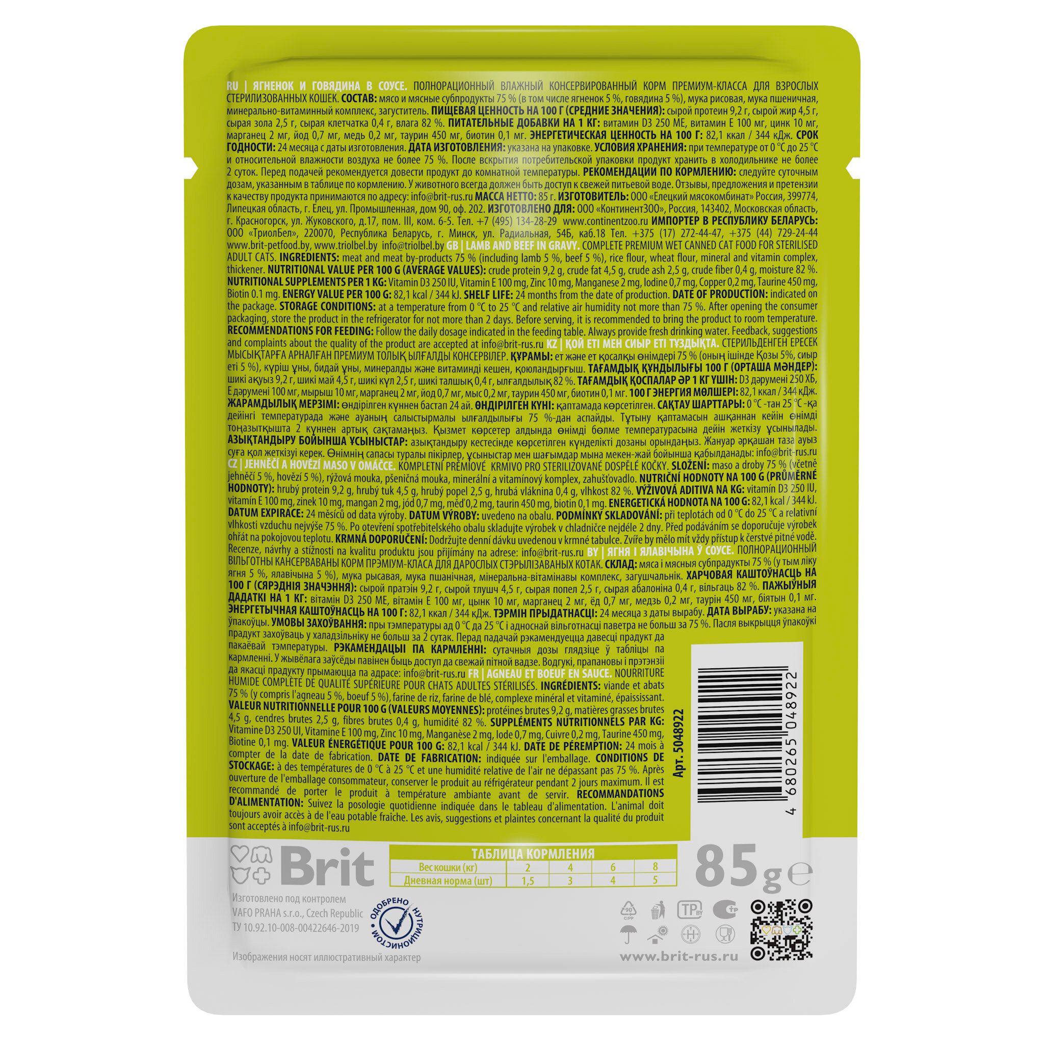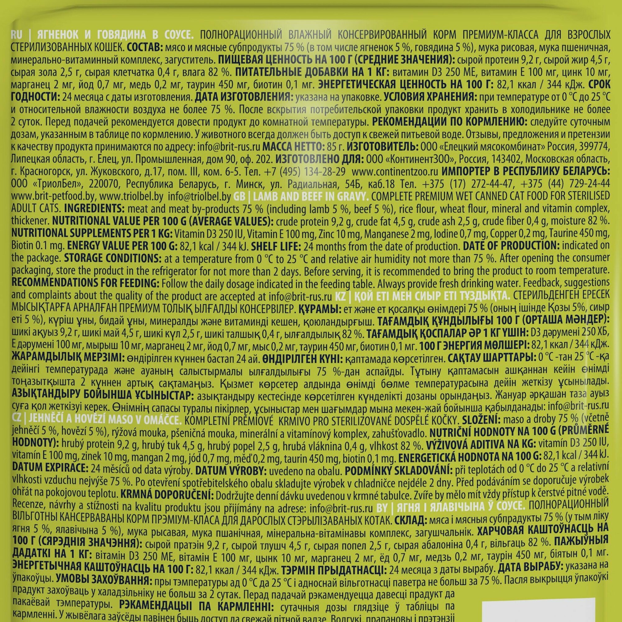 BRIT PREMIUM CAT LAMB & BEEF FOR STERILISED взр кастр кот и стер кошек с ягнен и говяд в соусе пауч 85 гр х 4 шт