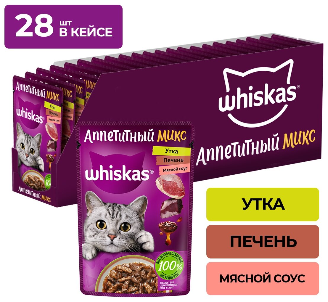 Влажный корм Whiskas "Аппетитный Микс" для кошек утка с печенью в соусе , 75 г х 28 шт