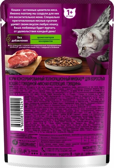 Влажный корм Whiskas Мясная коллекция с говядиной для взрослых кошек 75 г