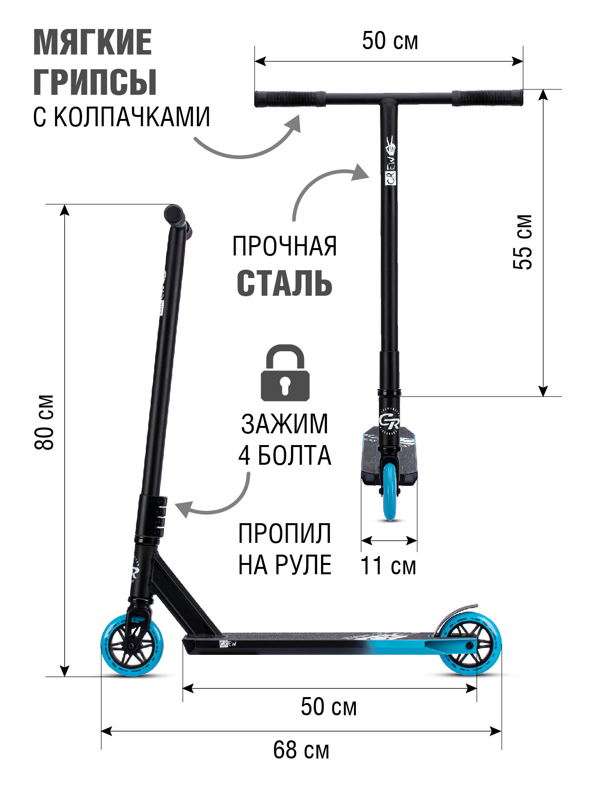 Трюковый самокат ТМ City-Ride CREW, колеса PU 110, алюминиевый хомут/дека 50*11 см, голубой, CR-SS-05BL интересное: