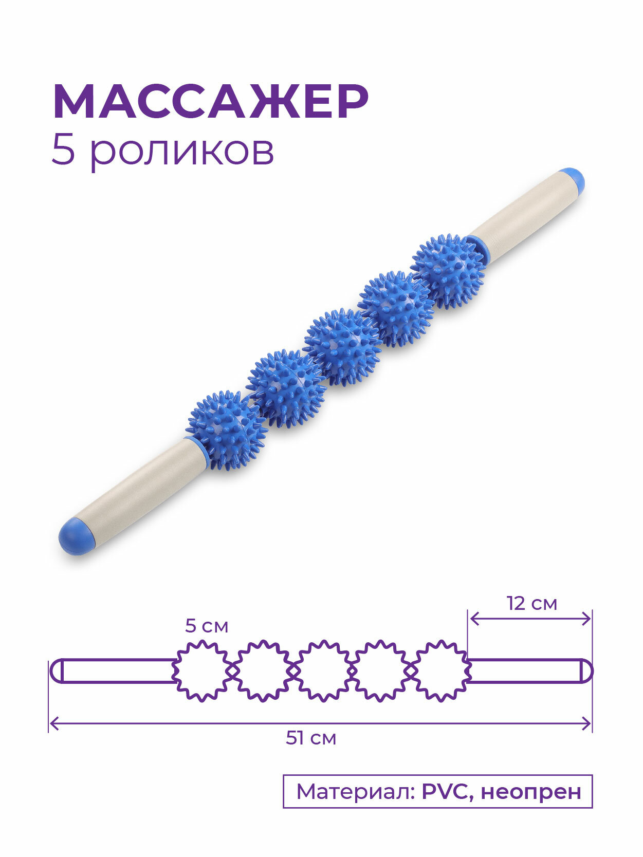 Роликовый ручной массажер для тела/Массажер для спины/Ролик антицеллюлитный/Скалка массажная INDIGO 5 роликов Синий 51х5,5х5,5см интересное: