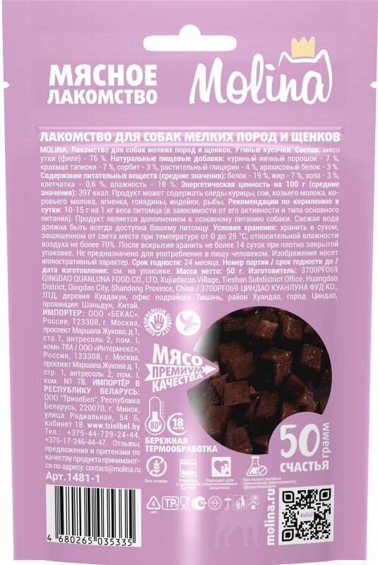 MOLINA, Лакомство для собак мелких пород и щенков, Утиные кусочки, 50 г
