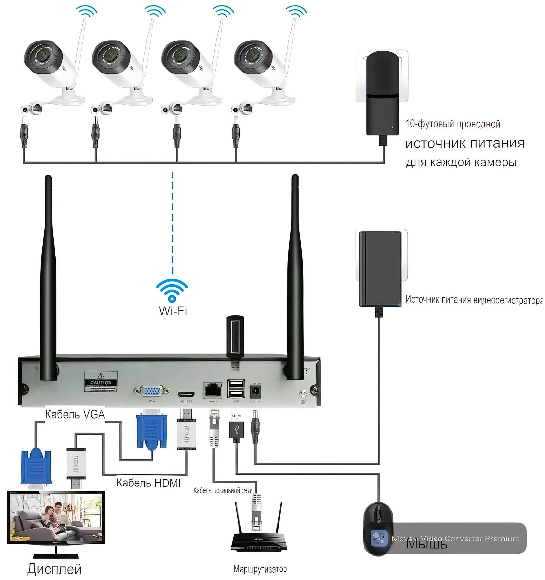 | Подробная комплектация | • Видеорегистратор с wi-fi приемником; Беспроводная wifi IP камера - 8 шт.; Блок питания для камер 220В /12В - 8 шт.; Блок питания для регистратора 220В /12В; Кабель HDMI для подключения доп. монитора - 1 шт; Сетевой кабель LAN (патч корд 1 метр) - 1 шт; Монтажный комплект для камер (винты + дюбеля) - 8 шт.; Wi-Fi антенна для видеокамер - 8 шт.; Выносная антенна - 1 шт ( для наиболее труднодоступной камеры); Наклейка с предупреждением о съемке (англ. язык) - 1 шт; USB – мышь; Документация; Упаковка. |