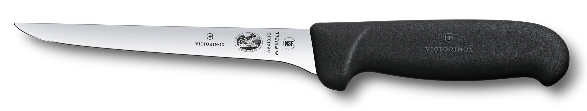 Ниже Вы можете прочитать отзывы на Нож кухонный Victorinox Fibrox (5.6413.15) стальной обвалочный лезвие 150мм прямая заточка черный, ознакомится с подробными характеристиками, посмотреть интересные обзоры и фотографии на Нож кухонный Victorinox Fibrox (5.6413.15) стальной обвалочный лезвие 150мм прямая заточка черный.