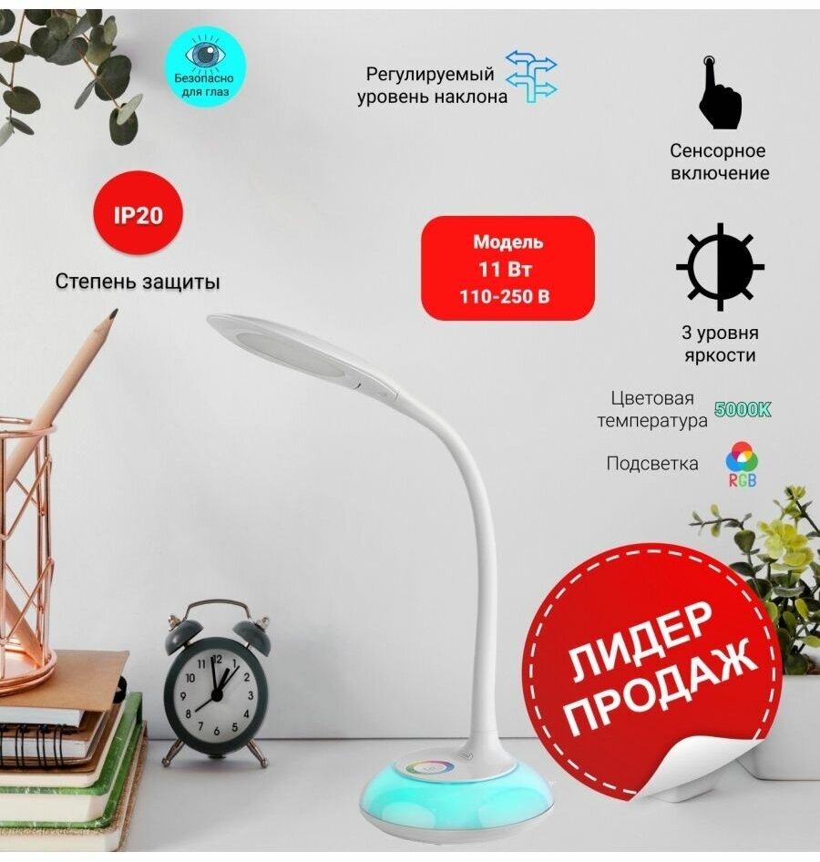 General GLTL-036 св-к настол св/д 11W(600lm)5К 5000К+RGB подсв. h55мм, сенс. димм. гибкий,бел 800036 интересное: