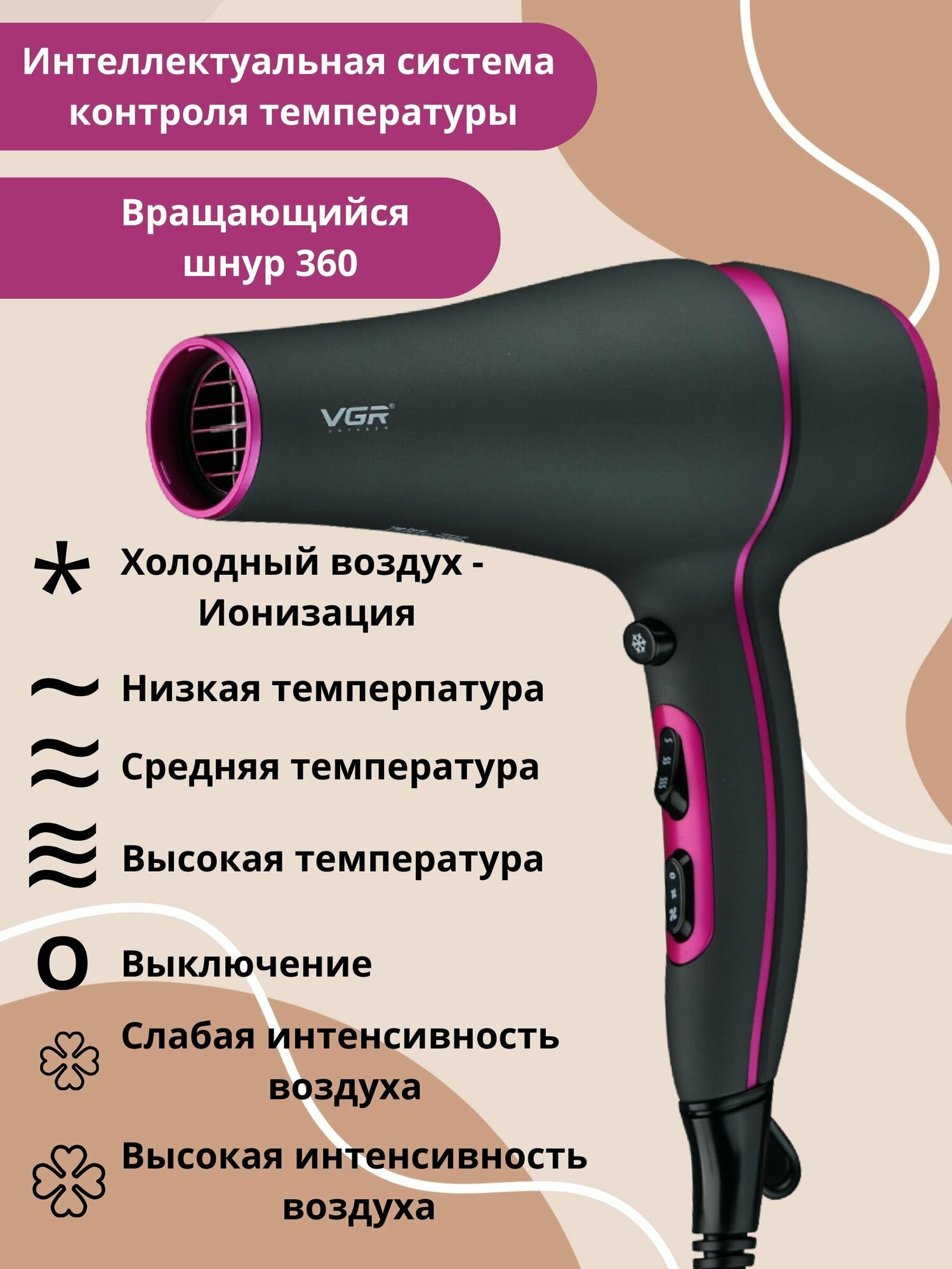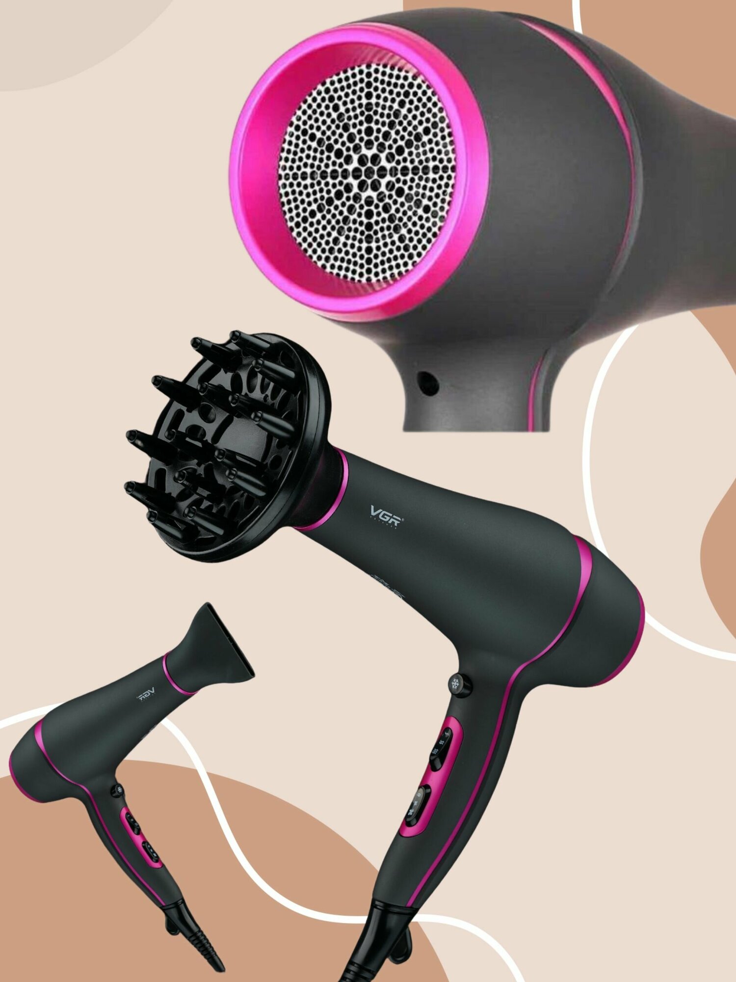 Фен для волос VGR V-402 Professional / Черно-розовый