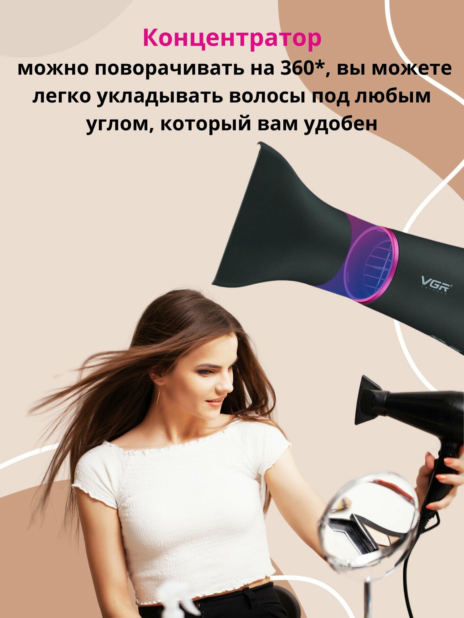 Фен для волос VGR V-432 с насадкой, складная ручка, компактный, дорожный