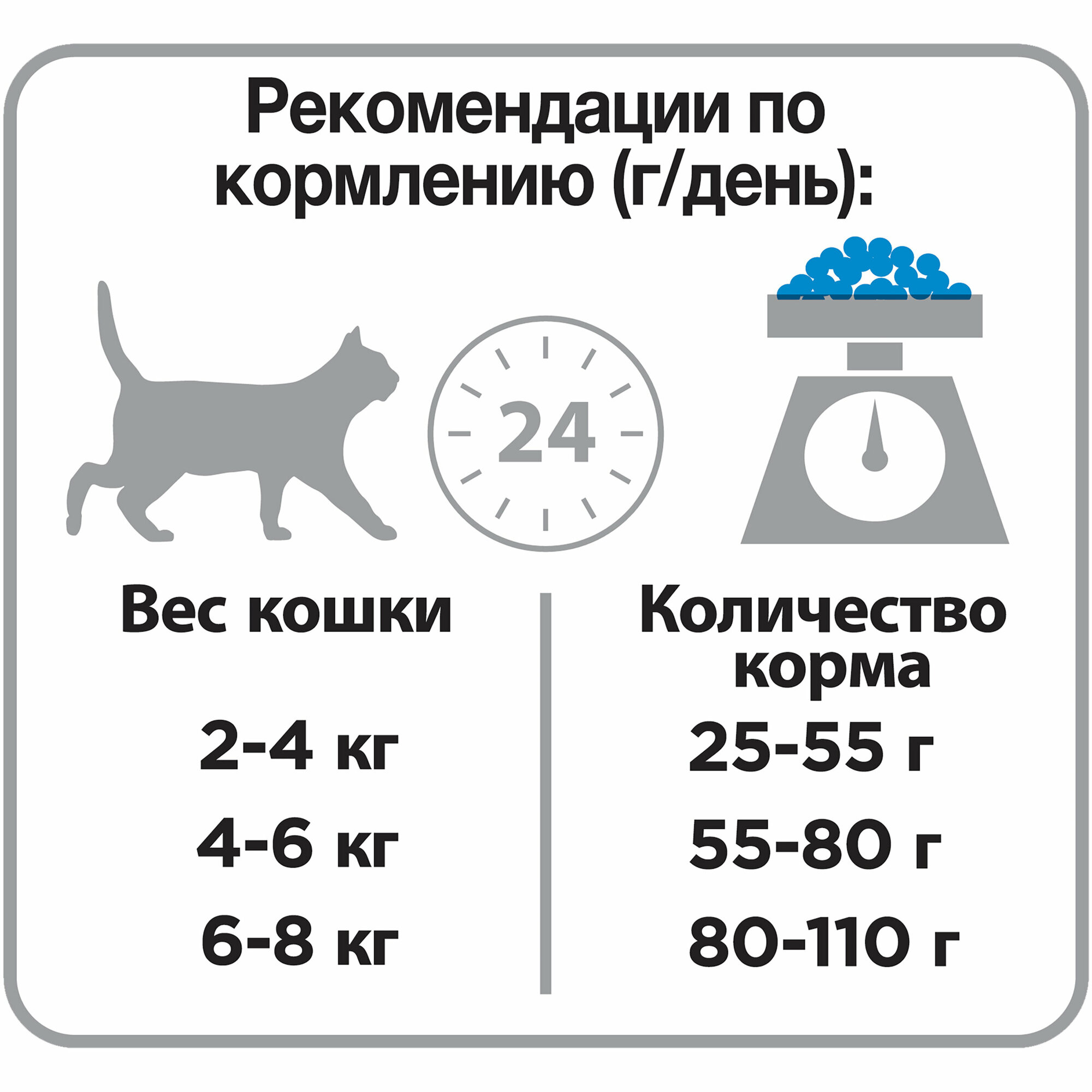 | Дополнительная информация | рекомендации по кормлению, позволяющие поддерживать идеальную форму могут варьироваться в зависимости от возраста животного, его активности и условий окружающей среды; следите за весом Вашей кошки и корректируйте количество даваемого корма; следите, чтобы у Вашей кошки всегда была чистая, свежая питьевая вода; для здоровья Вашей кошки регулярно консультируйтесь с ветеринарным врачом |