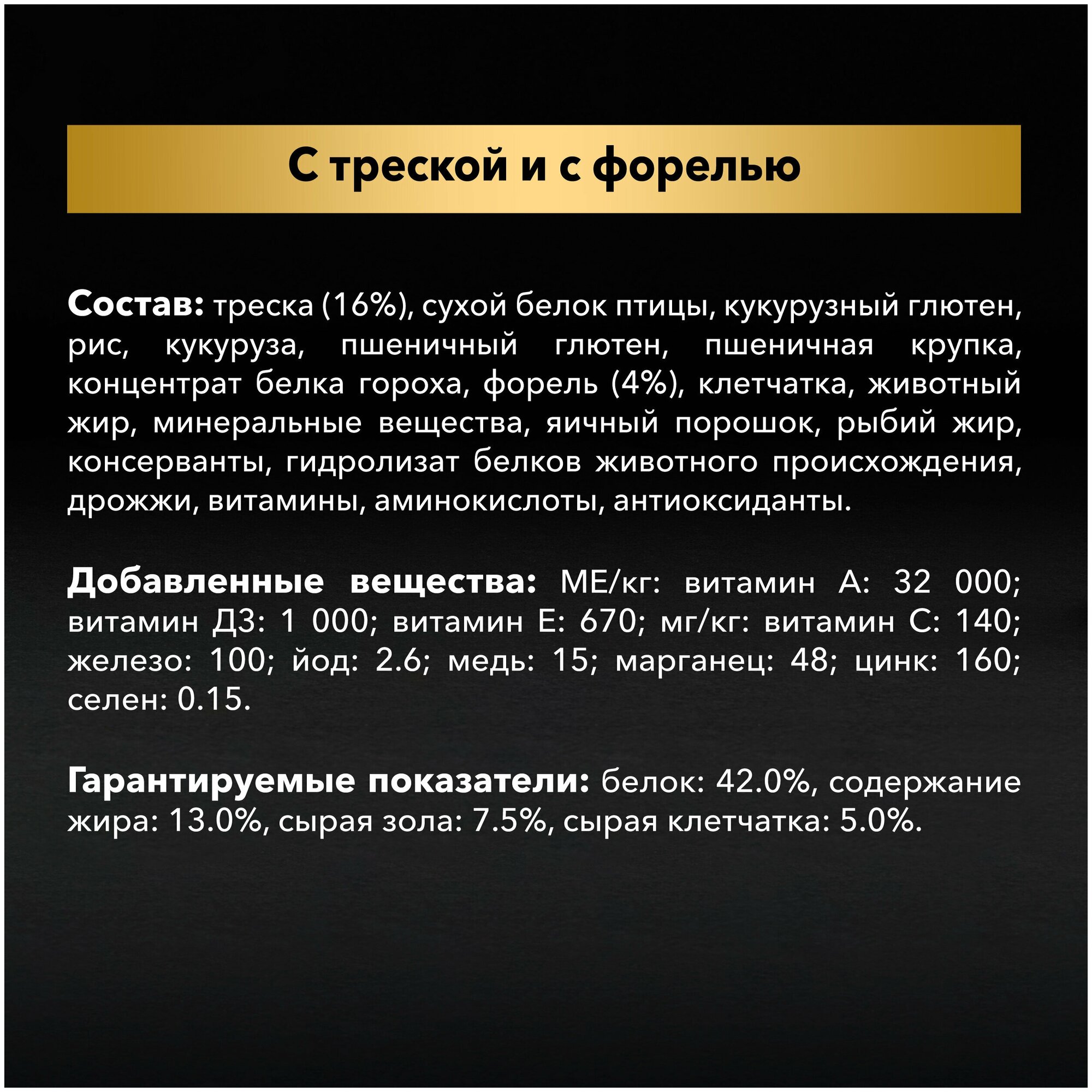| Дополнительная информация | треска (16%), сухой белок птицы, кукурузный глютен, рис, кукуруза, пшеничный глютен, пшеничная крупка, концентрат белка гороха, форель (4%), клетчатка, животный жир, минеральные вещества, яичный порошок, рыбий жир, консерванты, гидролизат белков животного происхождения, дрожжи, витамины, аминокислоты, антиоксиданты. |
