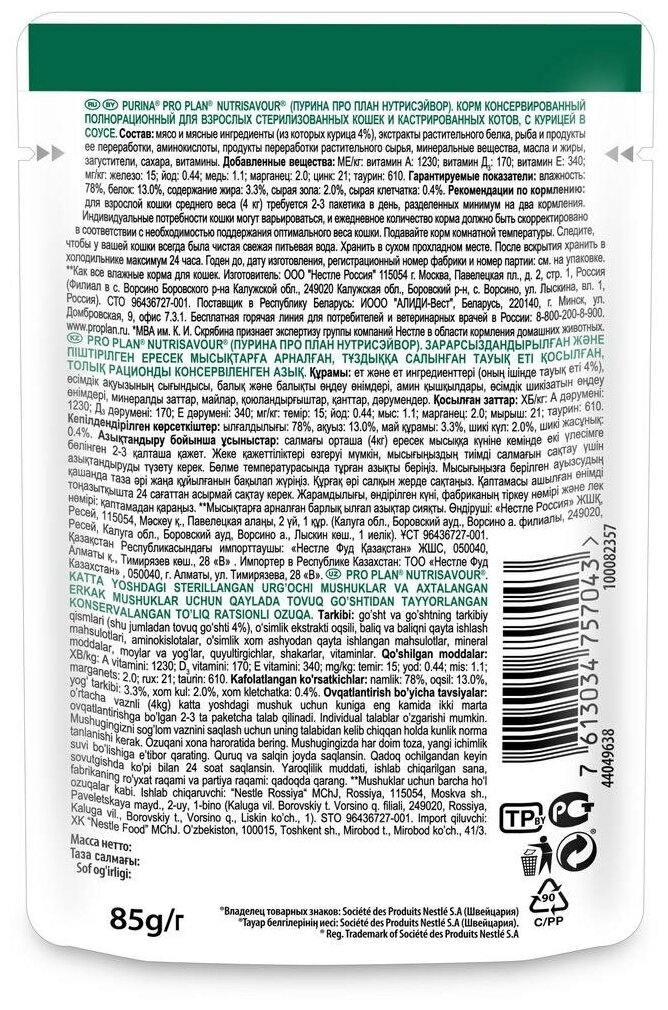 Влажный корм PRO PLAN для стерилизованных кошек, курица в соусе, пауч, 85 г интересное: