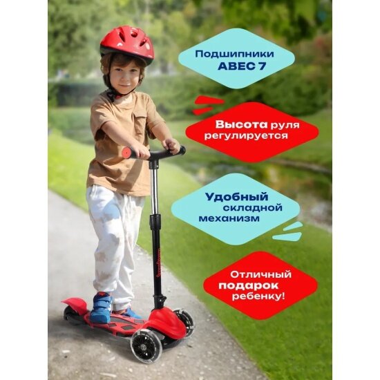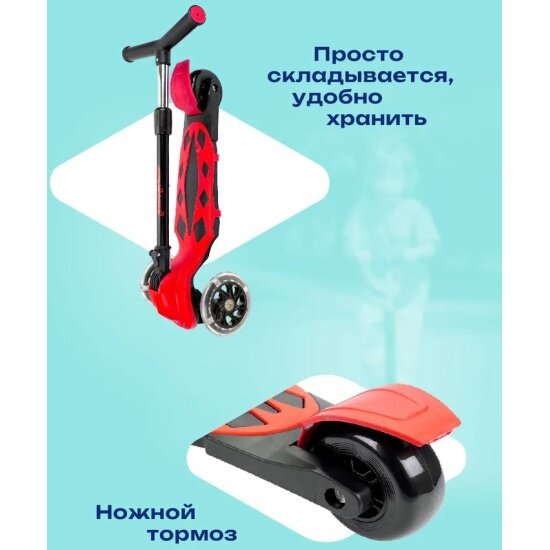 Самокат детский трехколесный складной, 120 мм PVC, со светом, красный Moby Kids