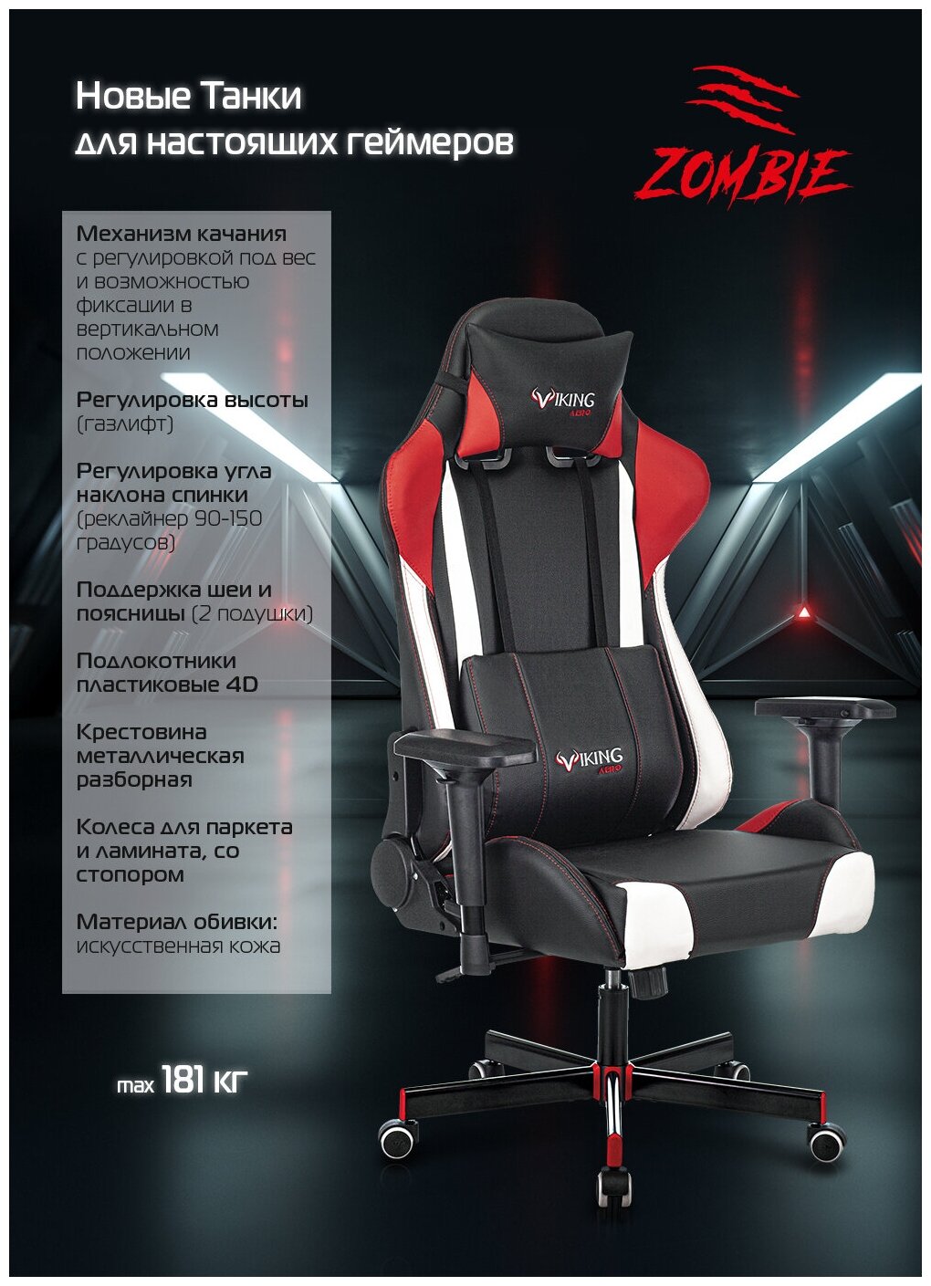 Купить Кресло игровое Zombie VIKING TANK черный / красный / белый, экокожа / Компьютерное геймерское кресло, с подголовником, 2 подушки, крестовина металл