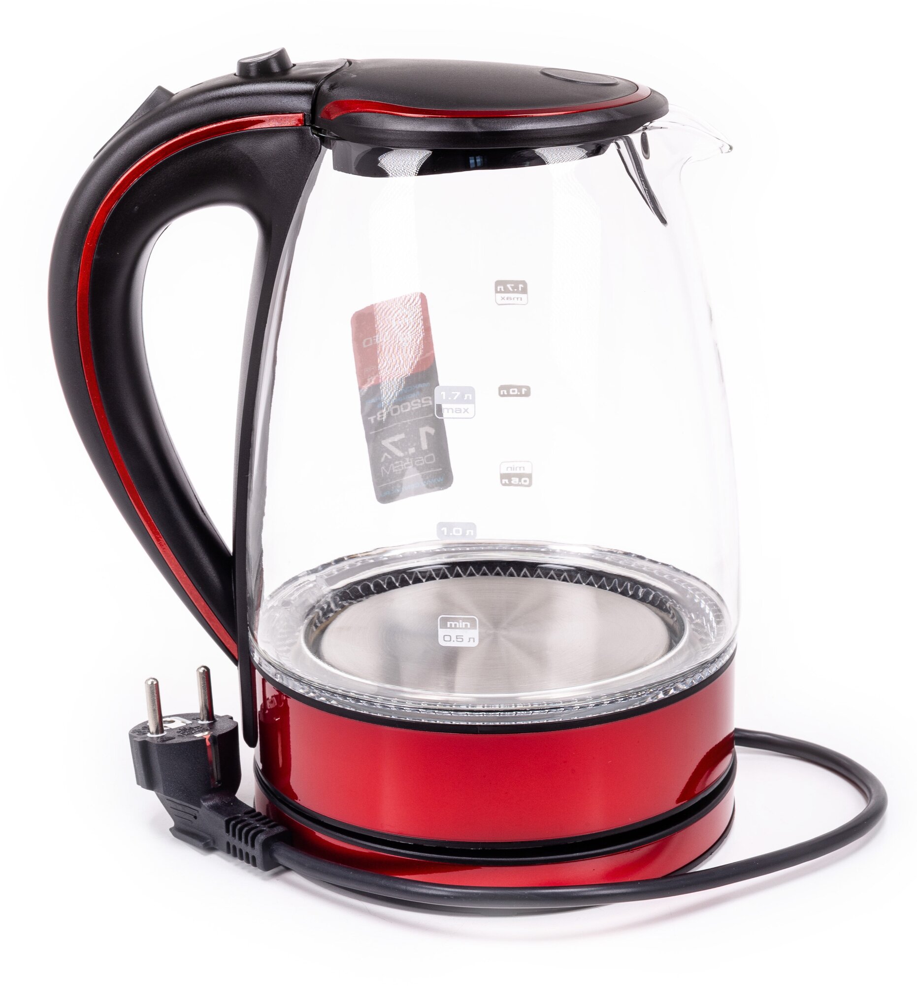 Чайник Centek CT-1009 BLR (красный/черный) стекло, 1.7л, 2200Вт, внутренняя LED подсветка, кнопка