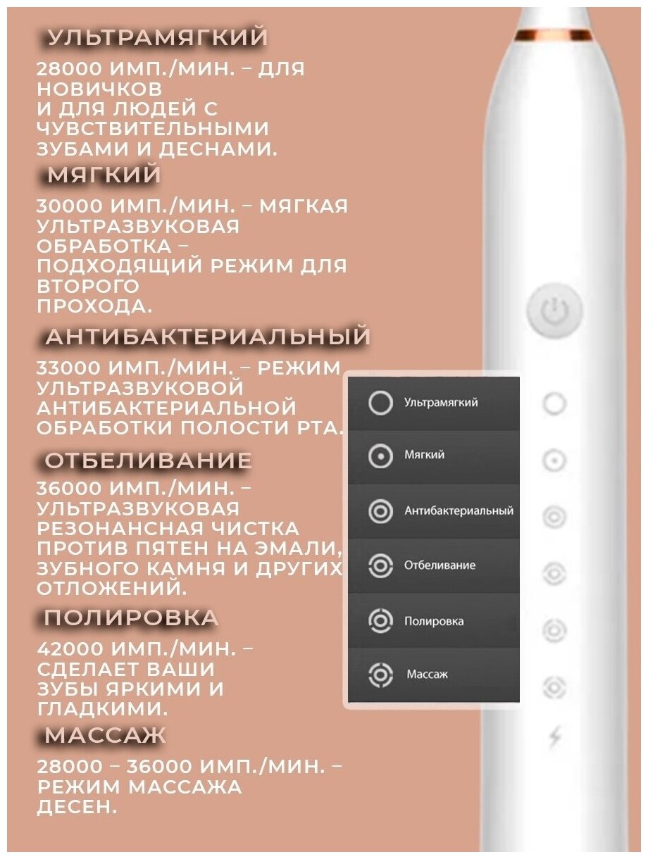| Режимы работы | деликатная чистка / ежедневная чистка / массаж / отбеливание |