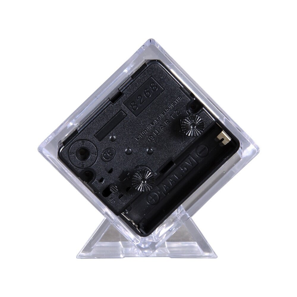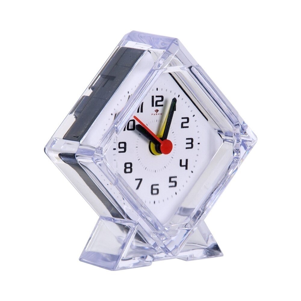 Будильник в форме ромба Рубин Классика для спальни с дискретным ходом корпус пластик прозрачный белый циферблат работа от батарейки АА высота 9 см