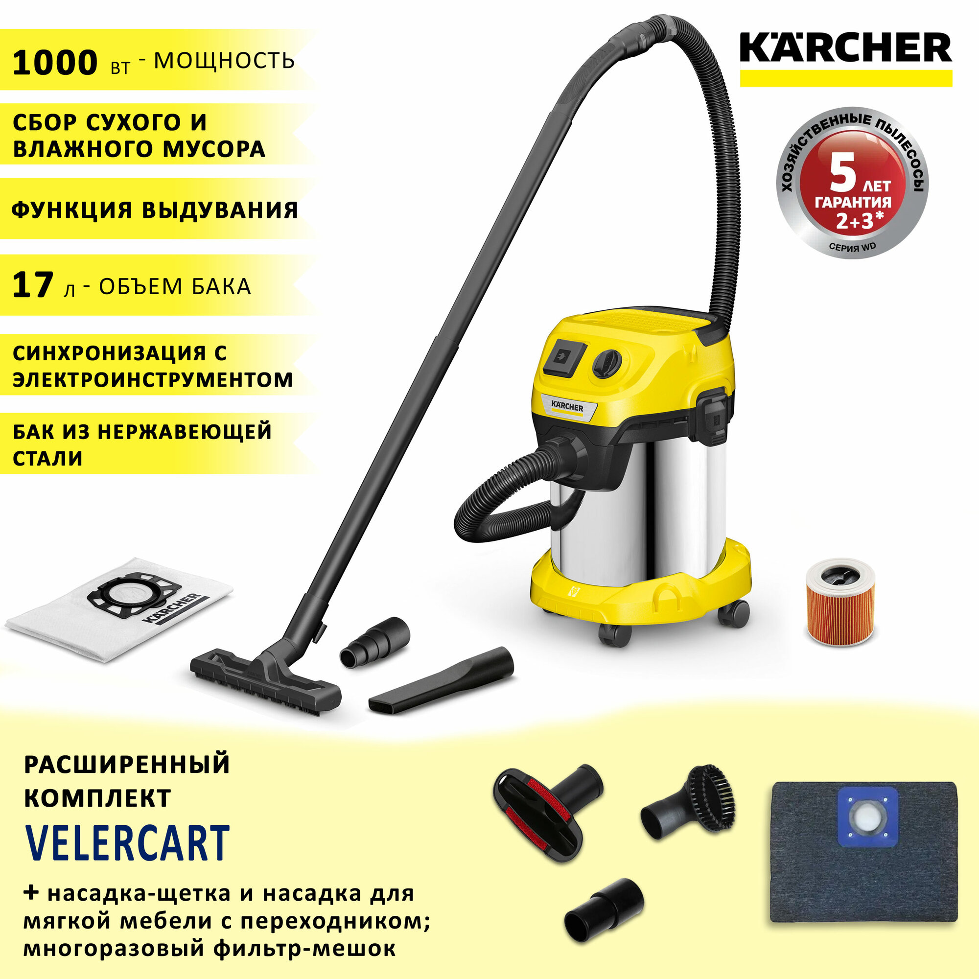 Купить Хозяйственный пылесос Karcher WD 3 P S V-17/4/20 Full Complect + многоразовый мешок, насадки для твердой и мягкой мебели