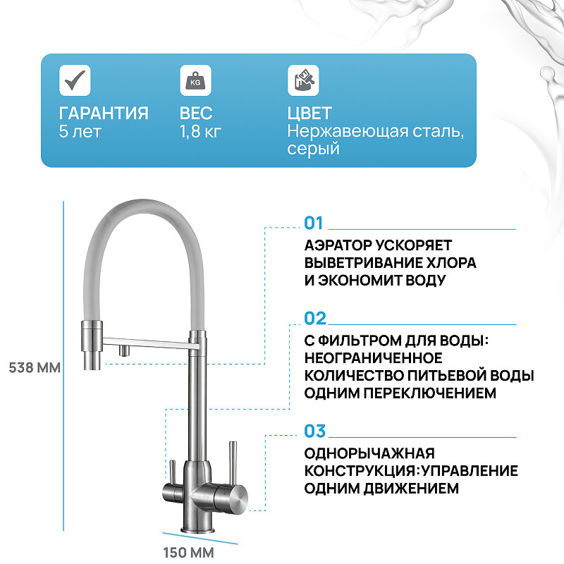 | Тип излива | гибкий / для фильтрованной воды / поворотный |