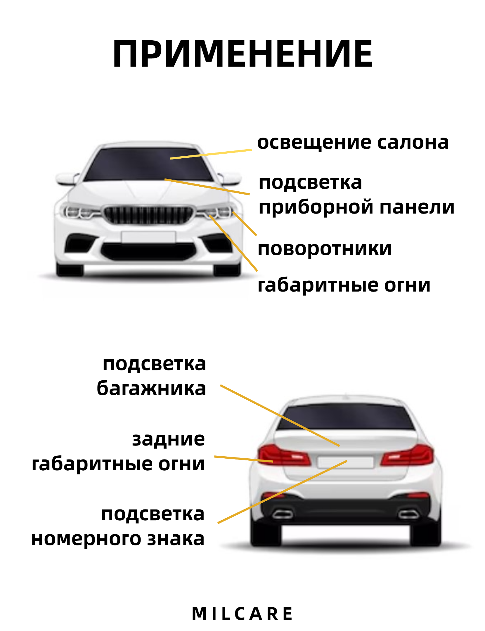 | Назначение | габаритные фонари / освещение багажника / освещение номерного знака / приборная панель / салонное освещение |