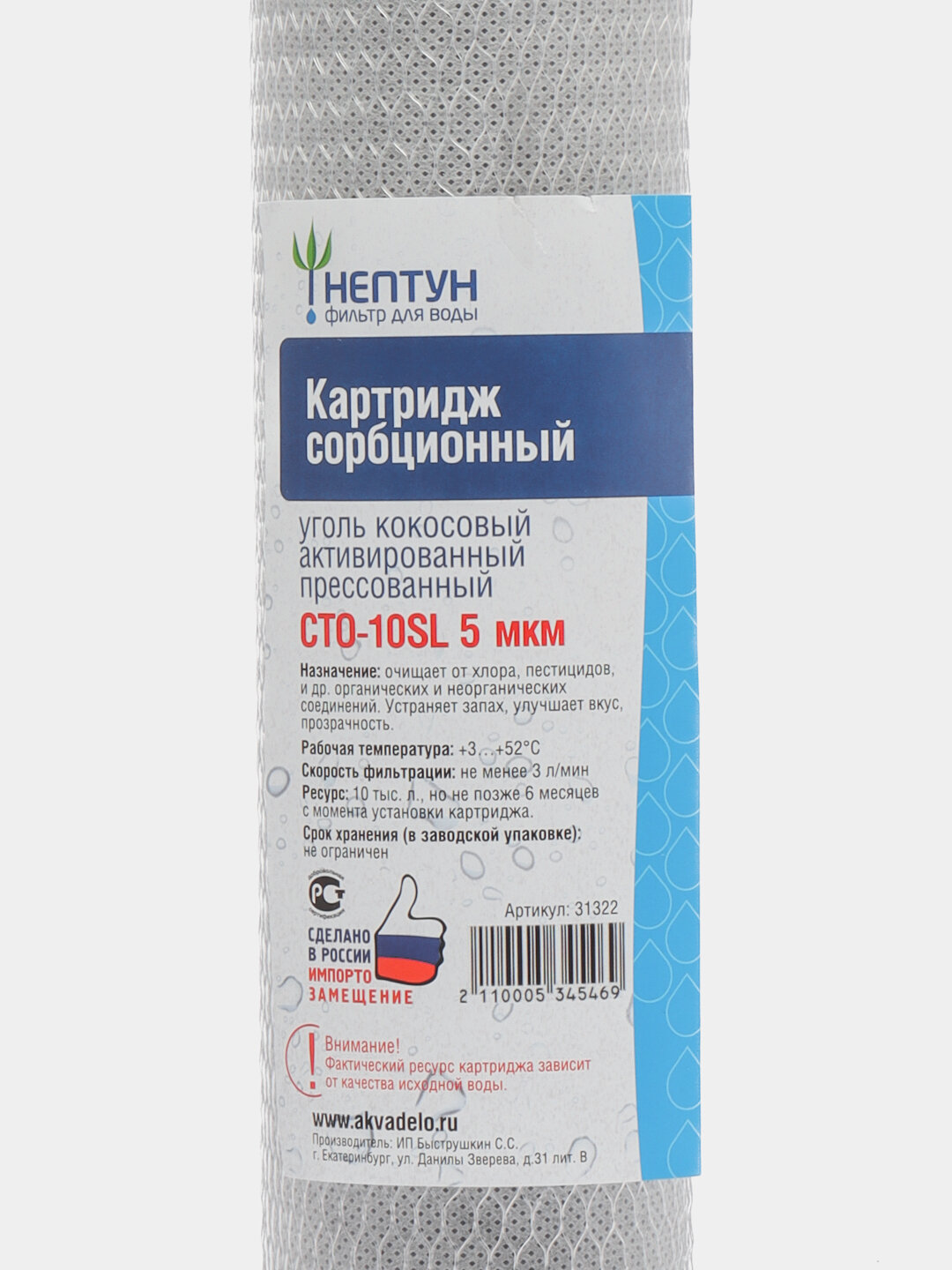 Картридж фильтра для очистки воды угольный кокосовый “Нептун” CTO-10SL 5мкм. Сорбционная очистка воды от хлора и т.д.