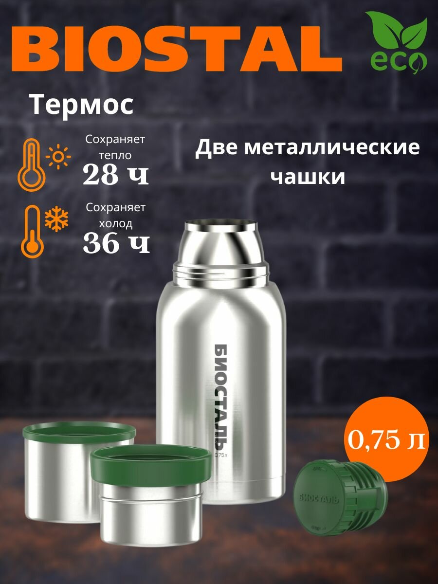 Термос Biostal Охота (0,75 литра), 2 чашки, стальной