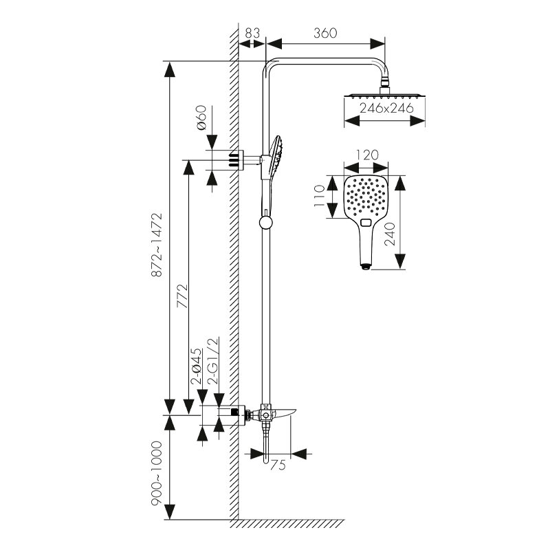 | Комплектация | Смеситель / лейка / верхний душ / шланг / эксцентрики / отражатели / рейлинг / инструкция |
