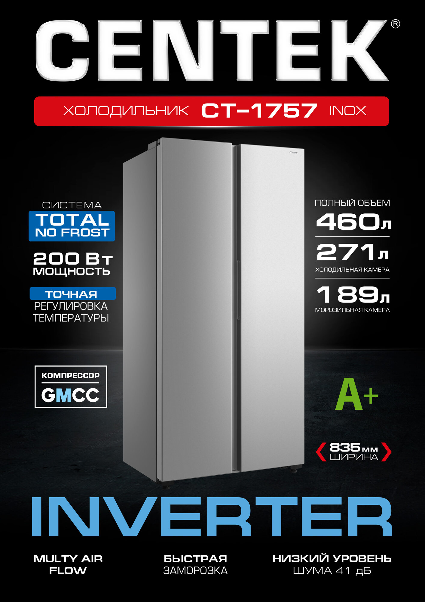 Холодильник CENTEKCT-1757 NF INOX - INVERTER, Side-by-Side, 460л (189л/271л), A+, GMCC, двухдверный