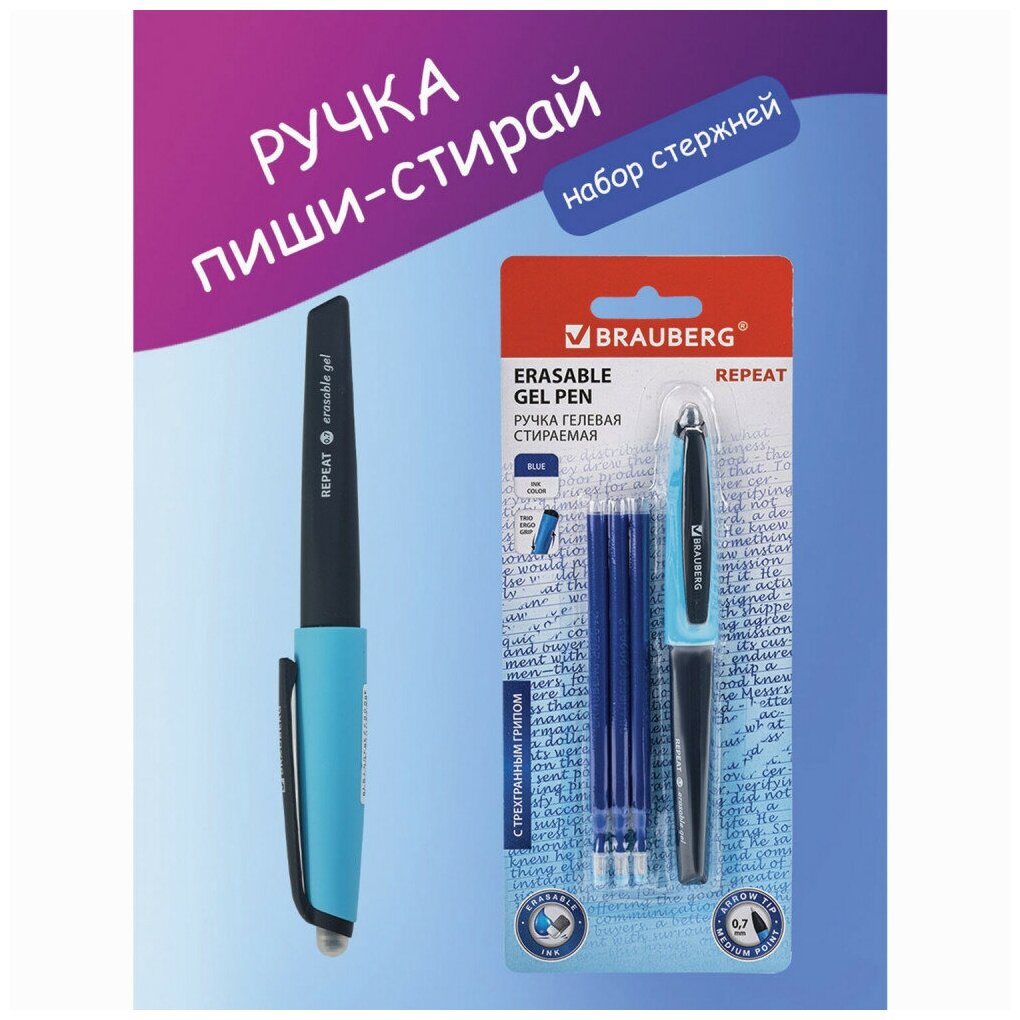 Ручка гелевая BRAUBERG стираемая с эргономичным грипом REPEAT, синяя, +3 сменных стержня, узел 0,7 мм, линия письма 0,5 мм