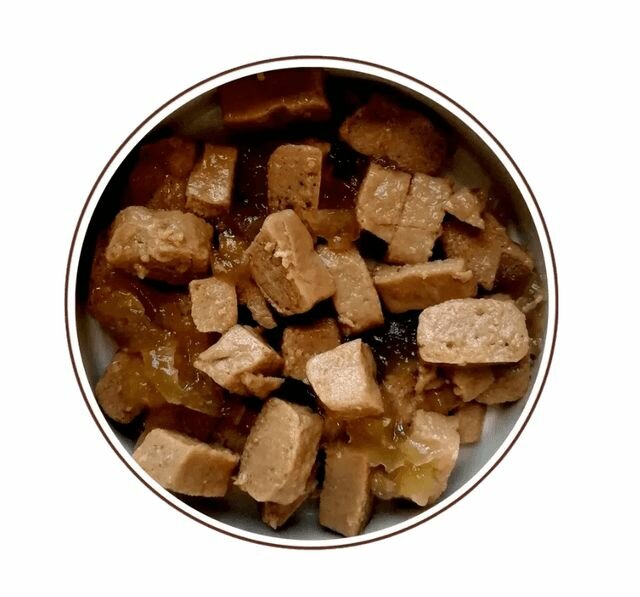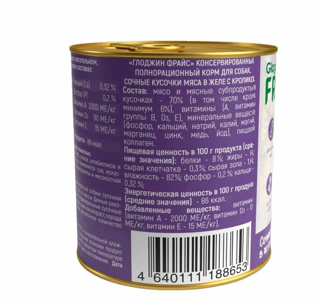 | Состав | мясо и мясные субпродукты в кусочках - 70% (в том числе кролик минимум 6%), витамины (А, витамины группы В, D3, Е, РР), минеральные вещества (фосфор, кальций, натрий, калий, магний, марганец, цинк, медь, йод), пищевой коллаген. |