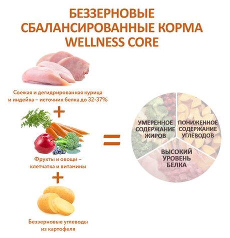| Состав | Индейка 32% (свежая индейка 16%, дегидрированная индейка 16%), курица 30% (дегидрированная курица 16%, куриный жир 8%, куриный соус 6%), горох, картофельный белок, свекольная пульпа 4%, льняное семя 3%, сушеный картофель, лососевый жир 1%, лигноцеллюлоза, морковь, яблоко, экстракт дрожжей(источник маннанолигосахаридов) 0,5%, сушеный корень цикория (источник фруктоолигосахаридов и инулина) 0,5%, брокколи, шпинат, томаты 0,01%, черника 0,01%, клюква, сушеная мята, Д-глюкозамин гидрохлорид 100 мг/кг, хондроитина сульфат 100 мг/кг, юкка Шидигера. |
