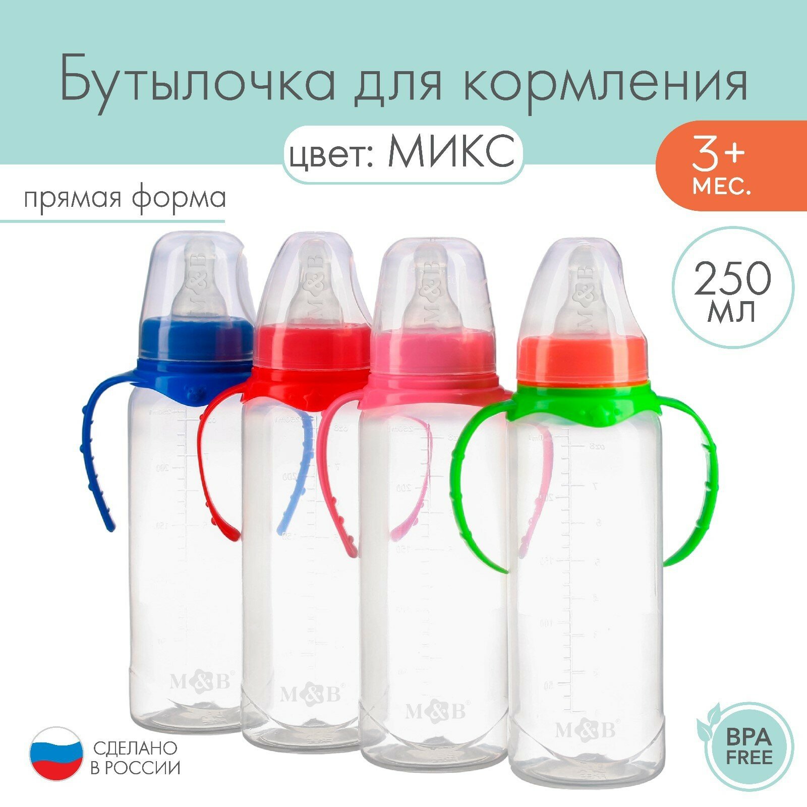 Бутылочка для кормления M&B, классическое горло, с ручками, от 3 мес, 250 мл, цилиндр, цвет микс
