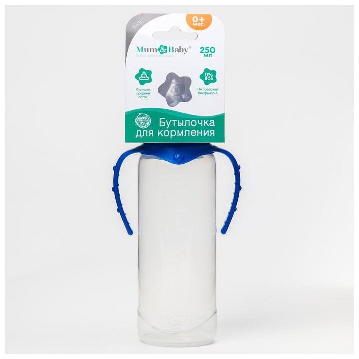 Mum&Baby Бутылочка для кормления, классическое горло, 250 мл., от 3 мес., цилиндр, с ручками, цвет микс