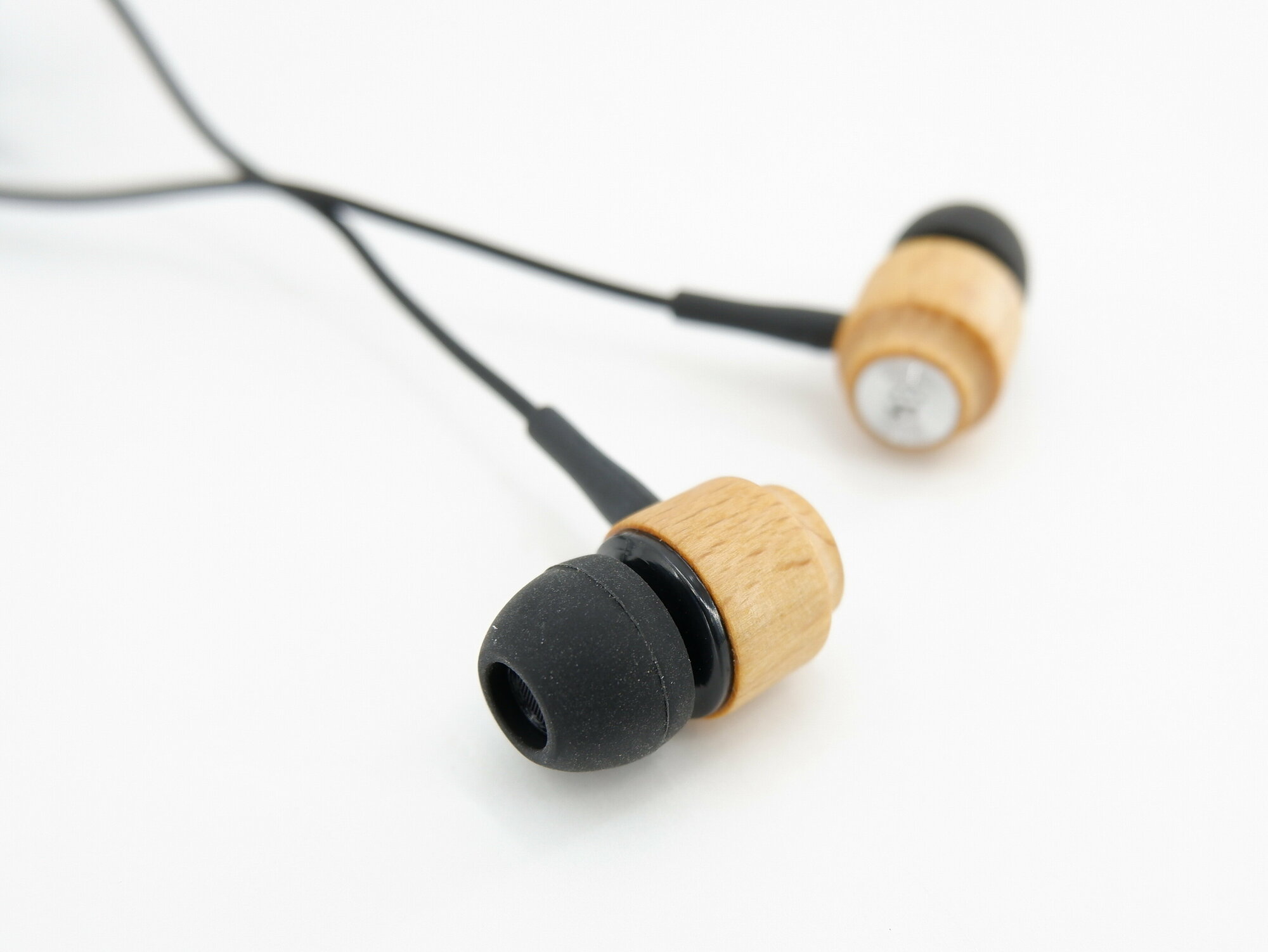 Деревянный корпус. Надёжно сидят даже при беге. Прищепка для фиксации провода. Г-образный разъём. Цена. |