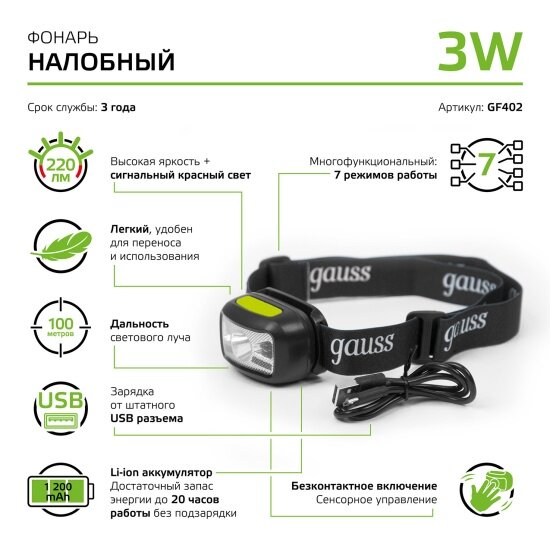 Купить Фонарь налобный Gauss модель GFL402 3W 220lm Li-ion 1200mAh LED 1/10/100