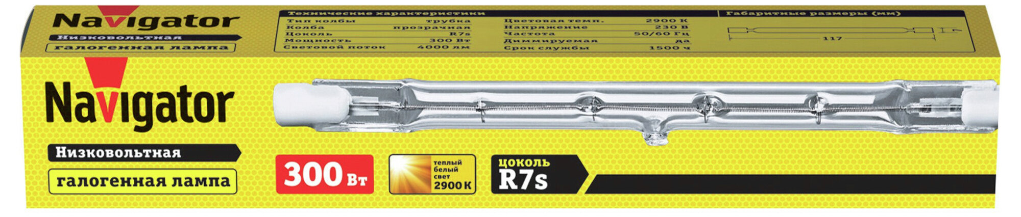 (25 шт.) Галогенная лампочка Navigator J117, мощность 300Вт, напряжение питания 220В, цоколь R7s, цветовая температура 2900 К, теплый белый свет, размер 117x7мм