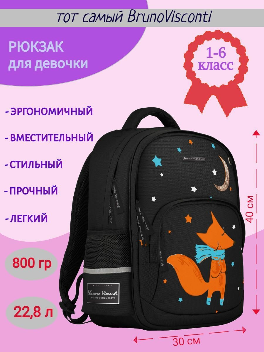 Рюкзак Bruno Visconti черный с эргономичной спинкой "волшебный ЛИС" Арт. 12-002-175/01