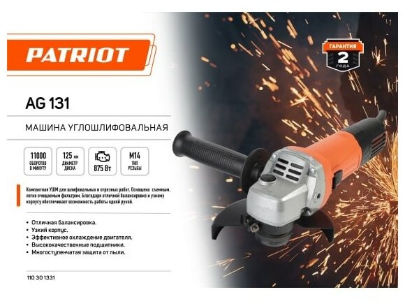 Машина углошлифовальная (УШМ) AG 131. 875Вт 11000об/мин 125мм М14 PATRIOT 110301331