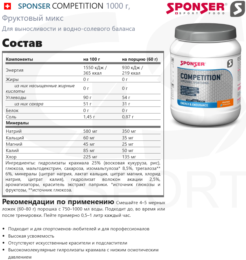 Гипотоник SPONSER COMPETITION 1000 г, Фруктовый микс интересное: