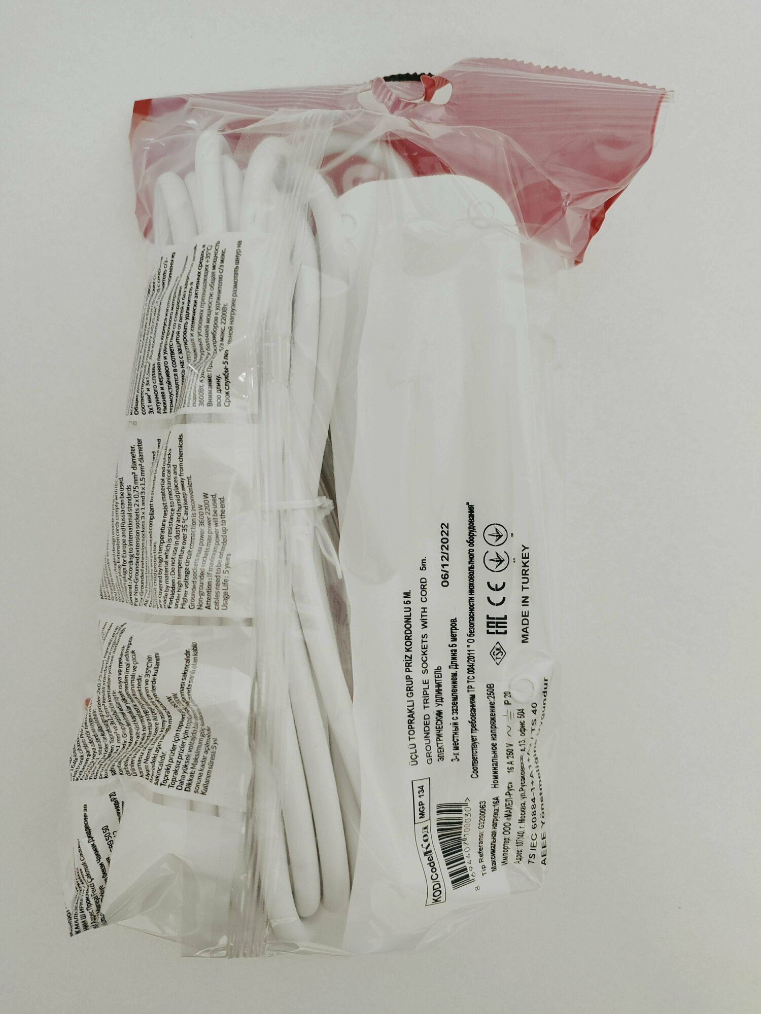 Удлинитель Makel 5 м метров длина розетки 2 гнезда с заземлением c/з Макел 3х1 ПВС электрический сетевой бытовой 3600 вт 220в белый, арт. MGP114