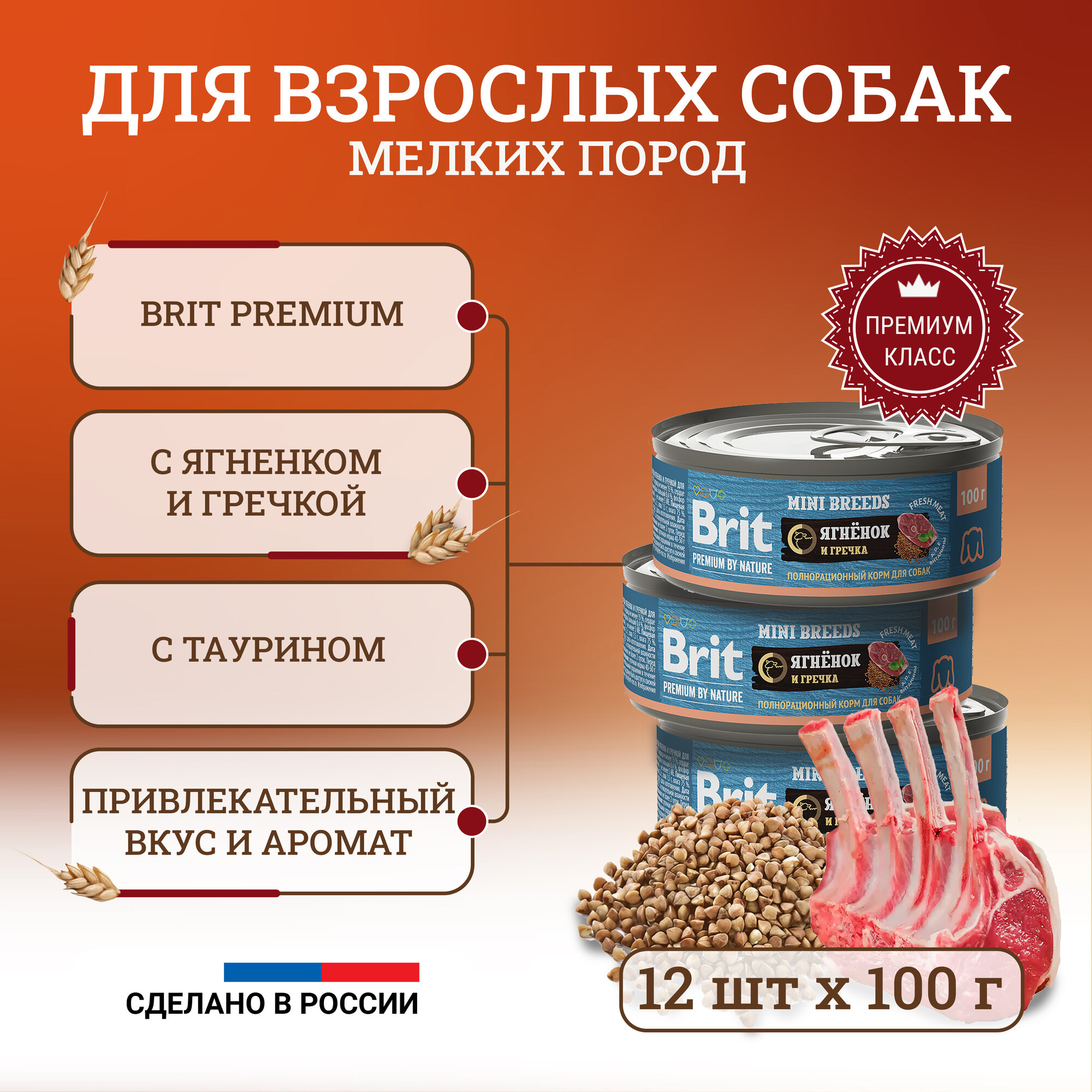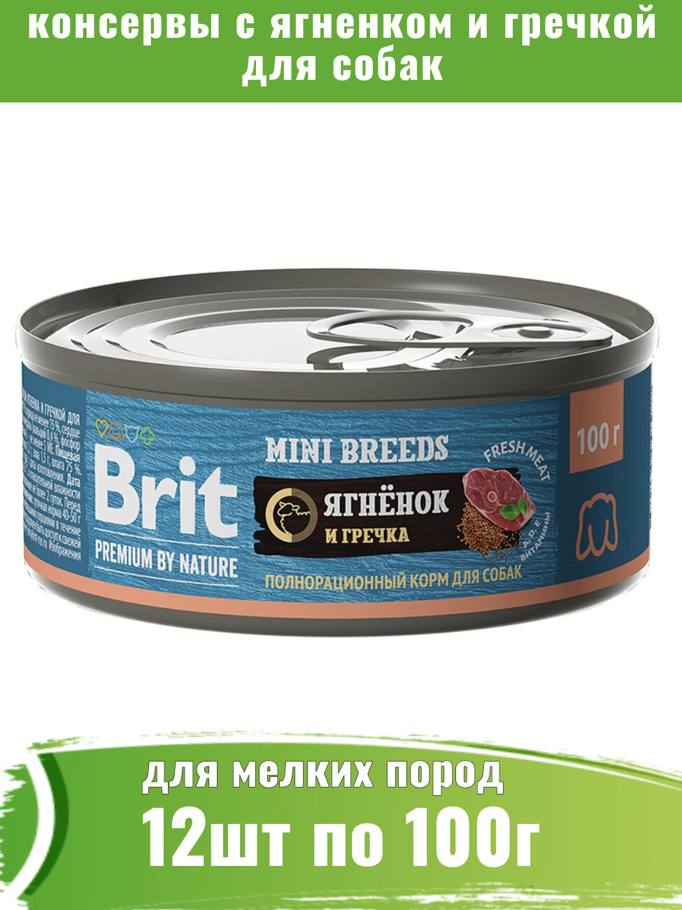 Brit Premium by Nature Mini Breeds полнорационный влажный корм для собак мелких пород, фарш из ягненка с гречкой, в консервах - 100 г х 12 шт